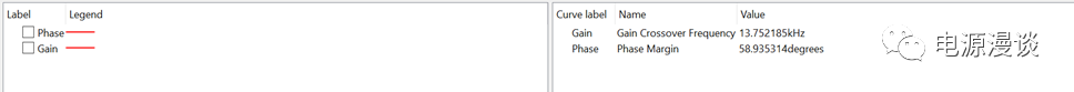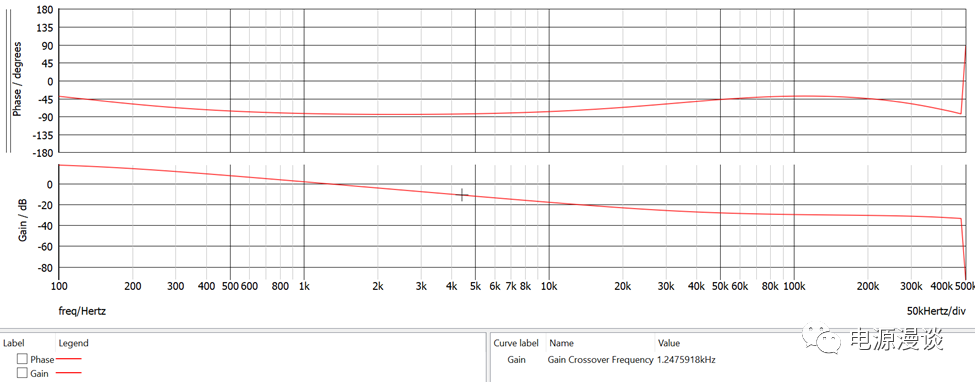 我們將測試補償器的Bode儀器使能,則得到如圖25所示的補償器的Bode圖,其穿越頻率為1k,符合我們設(shè)計的0頻率極點的參數(shù),整個增益和相位曲線也是正確的。