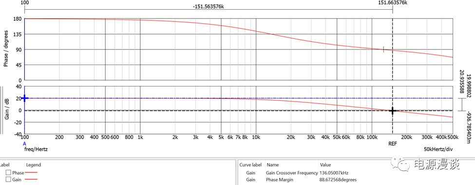 從圖11上的Bode圖測(cè)量值我們可以看出來,增益穿越0db在136k,對(duì)應(yīng)的相位為88.67C,使用光標(biāo)測(cè)量得到的穿越頻率為151k,接近計(jì)算值。同時(shí)我們看出,此系統(tǒng)低頻增益為20db,符合我們計(jì)算的值。