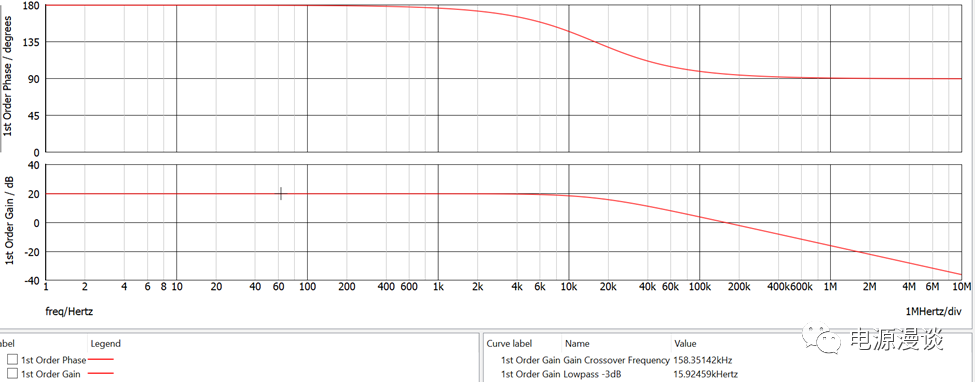 通過增益曲線,我們可以看出來,低頻段它的直流增益為20db,在轉(zhuǎn)折頻率后逐步以20db/10倍斜率下降,并且在158.4k穿越0db線。