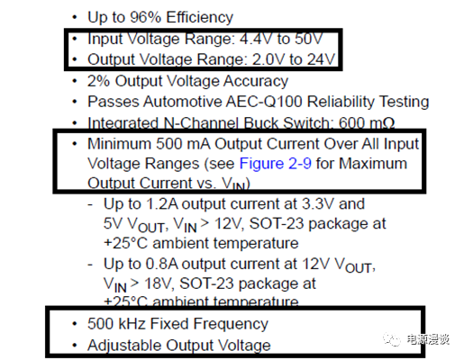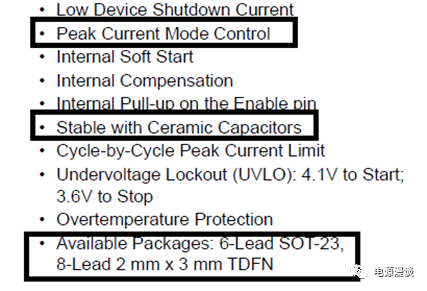 在圖1,圖2中,我們列出了規(guī)格書中描述的一些基本特性,簡單來說,它是一個固定頻率的,峰值電流模式控制的DC/DC變換器,輸入耐壓高達(dá)50V,全范圍輸入電壓最小輸出電流為500mA,體積非常小。
