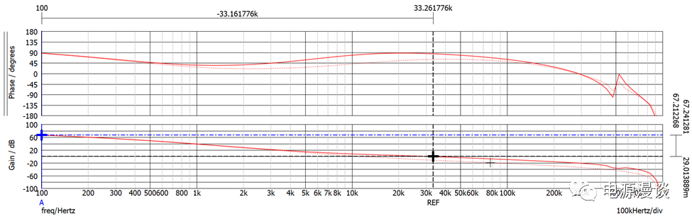增加前饋電容后,增益穿越頻率變?yōu)?/span>33k,相位裕量為85C,可以看出在中頻段增益和相位被有效抬起來了,如圖18所示。