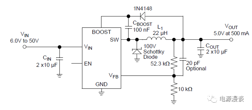 輸出為5V時的參考原理圖如圖5所示,它和3.3V輸出的差異就是輸出分壓電阻的差異,以及功率輸出電感的差異。