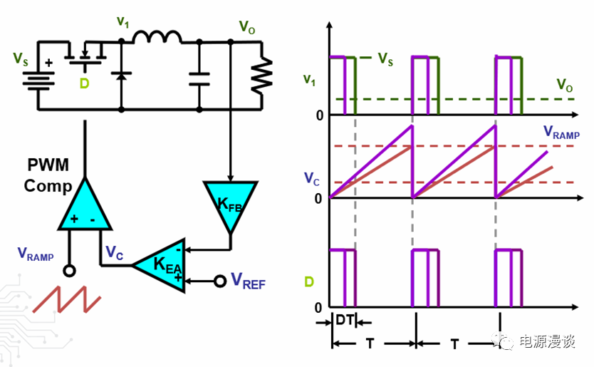 由于被控制量是輸出電壓,因此對輸出電壓進行采樣,期望的輸出電壓作為基準(zhǔn),二者比較產(chǎn)生控制誤差,這個誤差信號就作為PWM比較器的輸入和斜波比較,斜波電壓超過誤差信號時,開關(guān)管關(guān)斷,這樣通過調(diào)整誤差放大器的輸出電壓,就可以調(diào)整占空比大小。