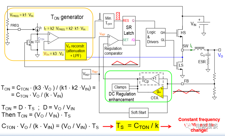 在COT電路的基礎(chǔ)上又進化出來自適應(yīng)COT架構(gòu),這種非線性控制方式的控制核心還是高速比較器,和COT控制的差異是它可以動態(tài)地根據(jù)輸入電壓和輸出電壓去調(diào)整導(dǎo)通時間,以維持開關(guān)周期的恒定,所以避免了一些應(yīng)用上COT變頻導(dǎo)致的問題。但是在瞬態(tài)工作時,其變頻的快速響應(yīng)的優(yōu)勢還是存在的,所以應(yīng)對負(fù)載快速瞬態(tài)時,電壓過沖或者跌落是很小的。