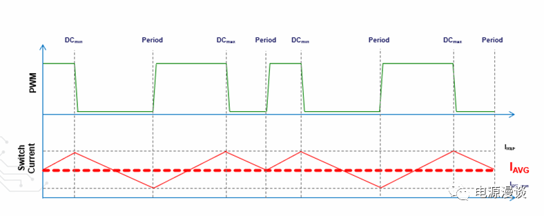 在峰值電流模式中,不得不提一下其中一個典型的問題,那就是斜坡補償問題,當(dāng)占空比大于50%時,會產(chǎn)生次諧波振蕩,振蕩頻率為開關(guān)頻率的一半,使得每個開關(guān)周期的電流起點不同,但是外部看來的平均電流確是恒定的,如圖4所示。