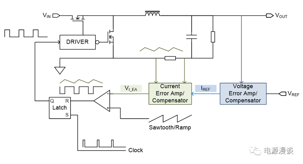 電流模式控制,除了具有一系列優(yōu)點之外,它還有一些不足之處,如全范圍的穩(wěn)定性,及抗噪聲干擾性能等,我們接下來會再進一步討論。電流模式控制有多種形式的變形,如峰值電流模式控制,谷值電流模式控制,平均電流模式控制等。我們先討論一下電流模式控制的一種典型形式,即峰值電流模式的結(jié)構(gòu),如圖2所示。