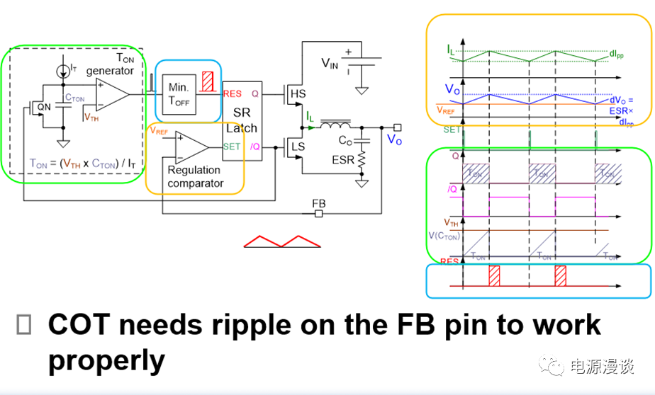 但是它的缺點也很明顯,主要是由于開關(guān)頻率隨著負(fù)載和輸入電壓變化是變頻的,所以它無法用外部時鐘去同步,由于它的控制核心是比較器滯環(huán)比較,所以必須使得輸出電壓存在一定的紋波,由于控制電路中不包含電流保護,所以這部分電路需要另外設(shè)計。雖然這種控制方式有這些缺點,但是還是被改良出來一些變化的控制方式,以避免這些缺點,COT控制及自適應(yīng)COT控制就是其中典型的類型。