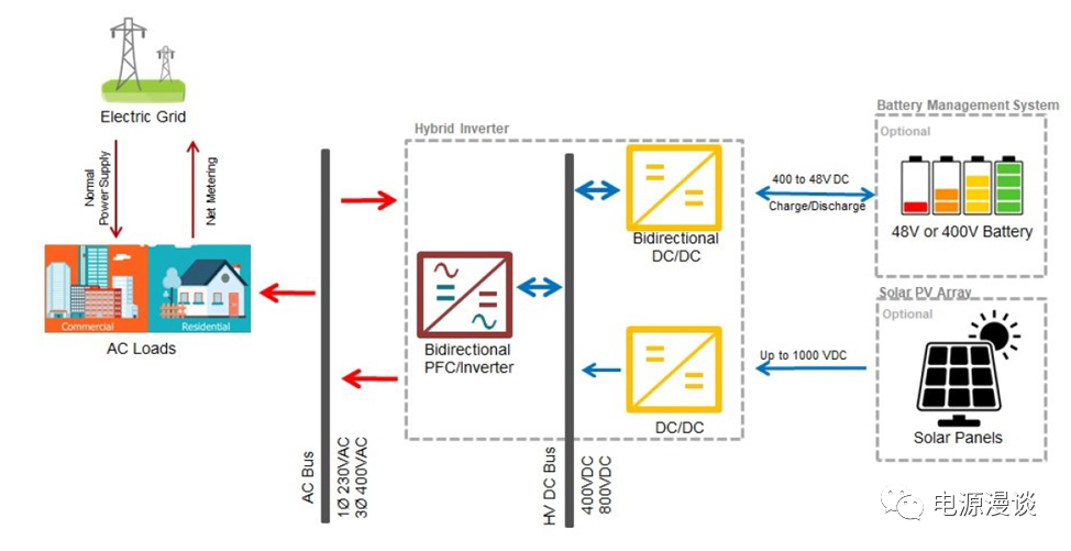如圖2所示,就是一個(gè)增加了儲(chǔ)能系統(tǒng)的光伏逆變器,這里的結(jié)構(gòu)和傳統(tǒng)光伏逆變器的結(jié)構(gòu)主要差異是,增加了一個(gè)電池組及電源變換器,電池用于存儲(chǔ)太陽(yáng)能,或者從電網(wǎng)對(duì)電池進(jìn)行能量存儲(chǔ),而電池中的能量在負(fù)載需求量大時(shí),通過(guò)電源變換器釋放給電網(wǎng)或者負(fù)載,這就要求這里的介于電池和直流總線電壓之間的變換器具有雙向轉(zhuǎn)換的功能,而系統(tǒng)一般也需要逆變器DC/AC部分,具有反向運(yùn)行的能力,這便于將電網(wǎng)能量通過(guò)DC/AC部分的電路及雙向DC/DC電路給電池充電。