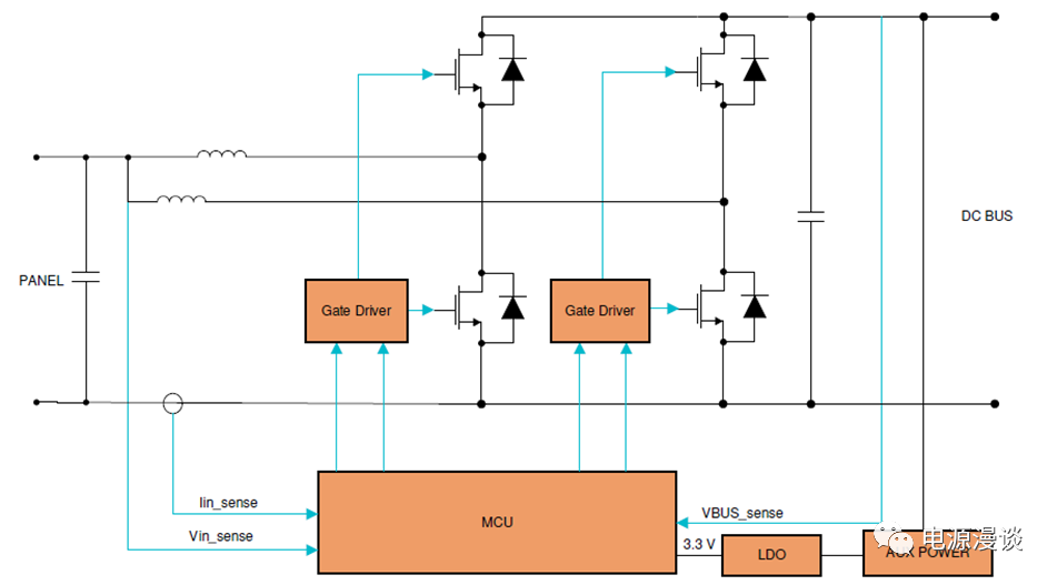 將圖2的原理框圖抽象出來(lái)就是如圖3所示的結(jié)構(gòu),從太陽(yáng)能電池到高壓直流電壓之間的電路部分和傳統(tǒng)光伏逆變器的結(jié)構(gòu)沒(méi)什么區(qū)別,都是帶MPPT的單向DC/DC電源,一般采用boost電路或者交錯(cuò)并聯(lián)boost電路,如要求隔離時(shí),可以采用隔離DC/DC變換器,如硬開(kāi)關(guān)全橋或者移相全橋,或者LLC等。