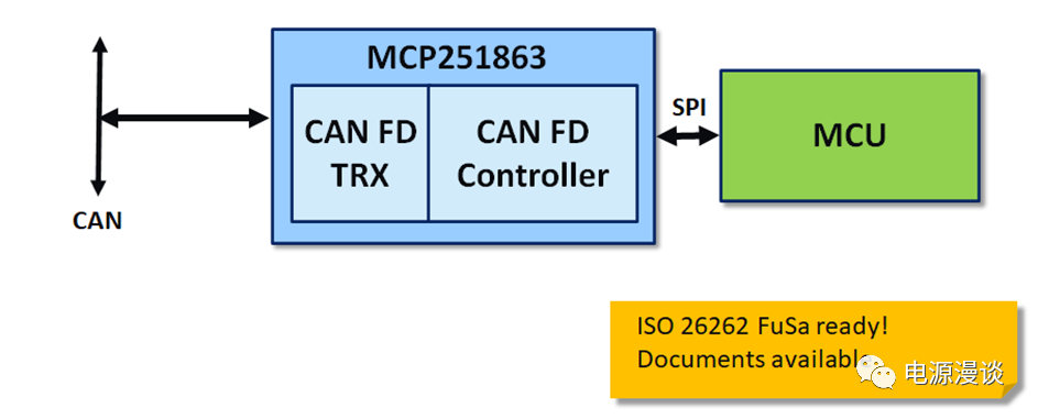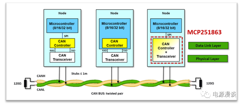 通常CAN節(jié)點(diǎn)的形式有以上三種組成,一種是MCU不帶CAN控制器,需要外加CAN控制器和收發(fā)器芯片,第二種是主控芯片集成了CAN控制器,需要外加一個(gè)CAN收發(fā)器,MCP251863就是第三種情況,不帶CAN控制器的主控芯片連接一個(gè)MCP251863就可以實(shí)現(xiàn)CAN節(jié)點(diǎn)功能,將數(shù)據(jù)鏈路層和物理層功能都涵蓋在這一芯片下。