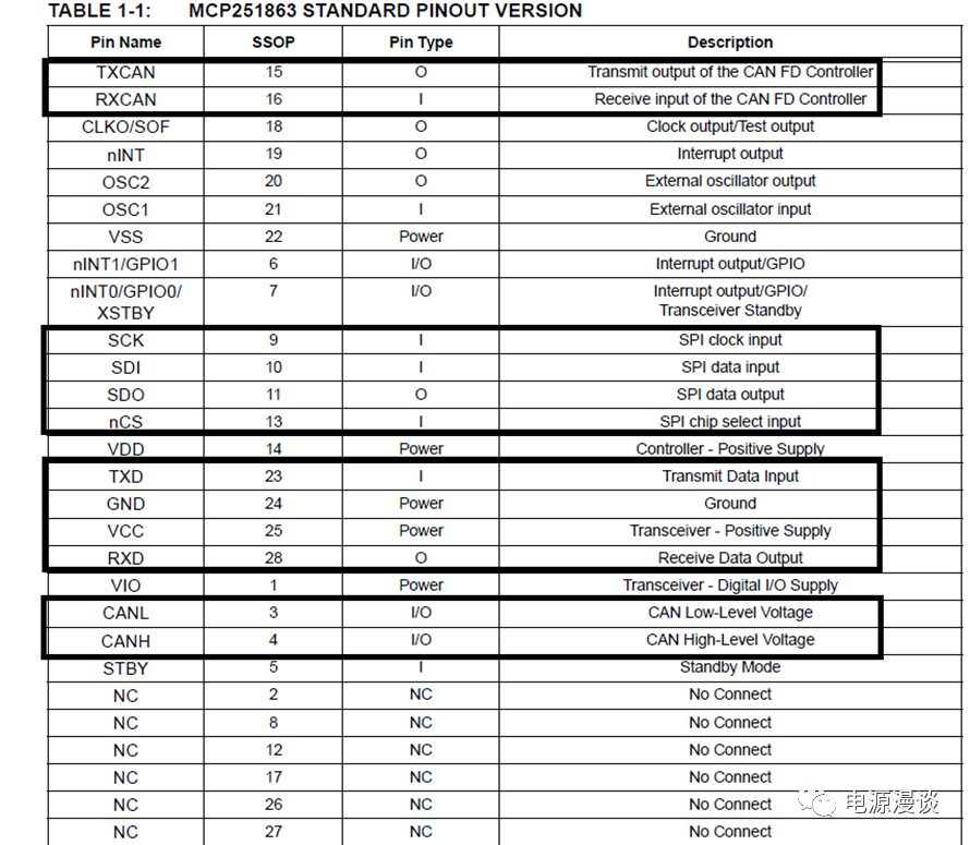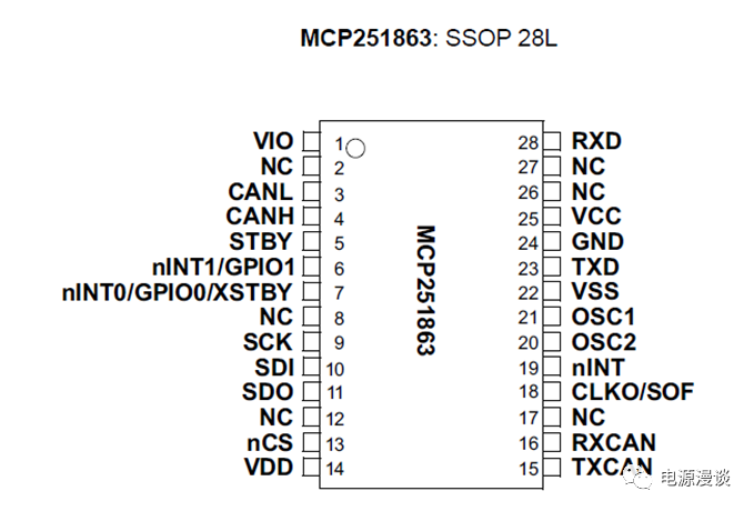 MCP251863是一個(gè)SSOP-28的封裝,接下來(lái),我們?yōu)g覽一下其pin腳說(shuō)明。