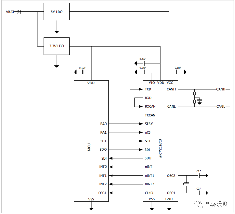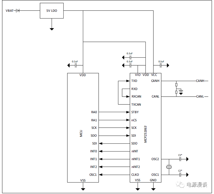 圖2中給出了采用SPI通信連接主MCU和MCP251863的示意圖,MCU可以通過(guò)SPI去控制和配置CAN芯片。