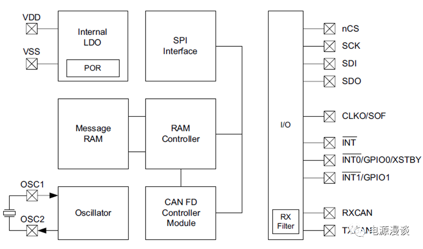 簡(jiǎn)單check一下幾個(gè)電源pin的連接,VDD是CAN FD控制器的電源,VCC是CAN收發(fā)器的電源,而VIO是數(shù)字I/O的電源,這里示意圖中,MCU供電是3.3V,則VDD和VIO連接在一起供電3.3V,而收發(fā)器的電源單獨(dú)供電5V.