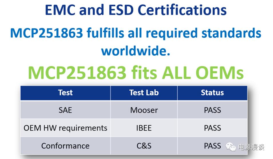 其次,EMC的性能非常好,Microchip已經(jīng)獲得了多種EMC的測(cè)試通過(guò)的證書(shū),如圖4所示。本身從原理上講,集成CAN控制器和收發(fā)器這種形式就降低了EMC問(wèn)題的發(fā)生。