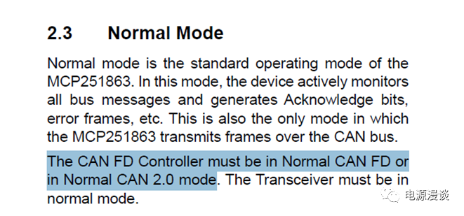 MCP251863支持兩種模式,一種是CAN2.0模式,另一種是CAN FD模式,在CAN2.0模式下只能發(fā)送接收CAN2.0的幀,而在CAN FD模式下,可以同時(shí)有CAN FD幀和CAN2.0幀兩種形式。