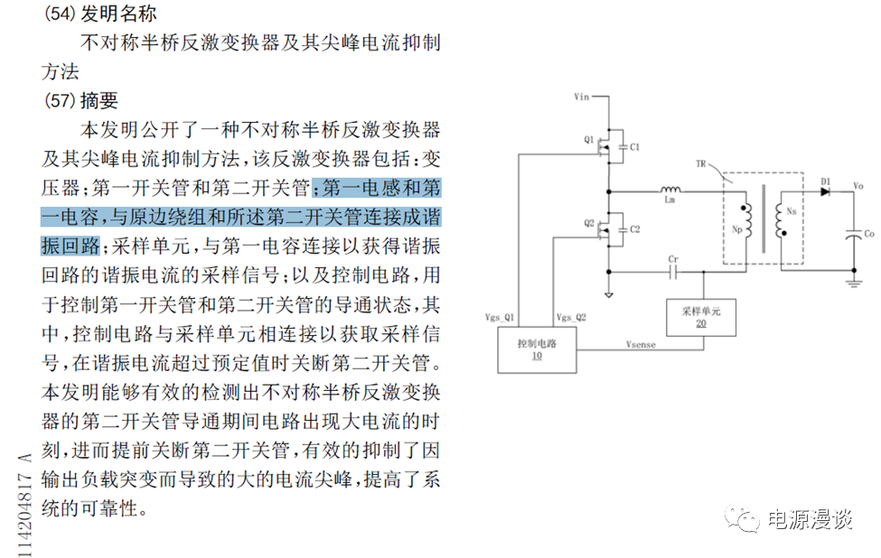 這里分析一個關(guān)于不對稱半橋反激變換器的專利,這個專利主要是關(guān)于解決一個諧振電流尖峰的問題。