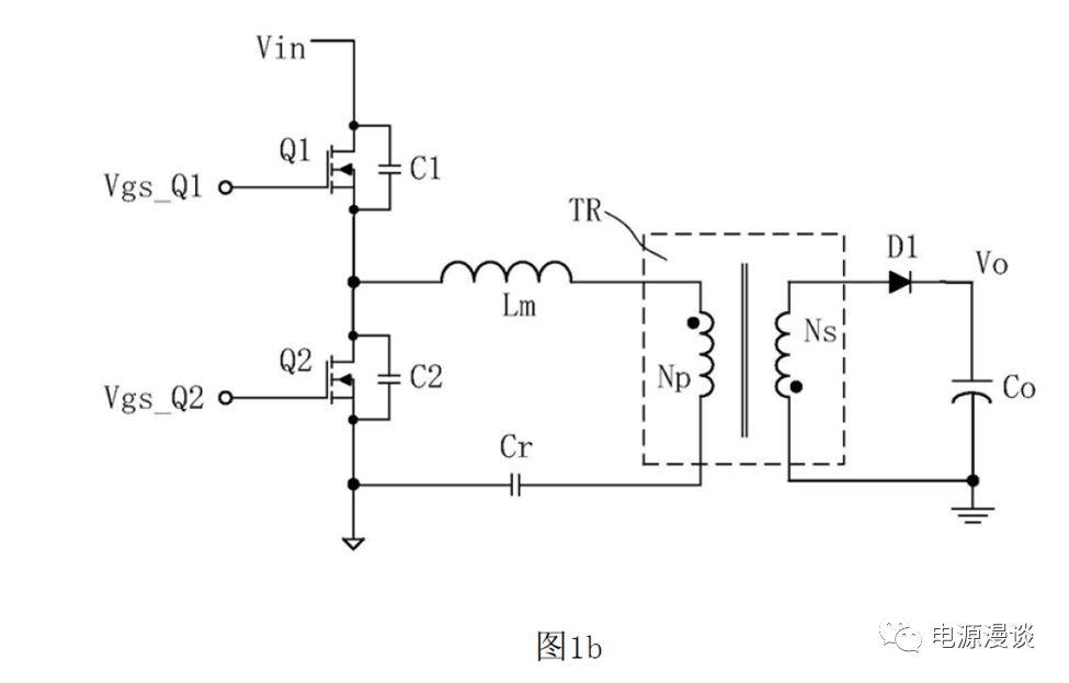 當(dāng)不對稱半橋處在穩(wěn)態(tài)時,諧振電容的電壓,很容易由拓?fù)浣Y(jié)構(gòu),如圖3可知,為N*Vo,N為原副邊繞組比。但是在瞬態(tài)時Cr上的電壓變化較大,典型的瞬態(tài)如輸出短路等。當(dāng)瞬態(tài)時Cr上的電壓變化較大,因此在第一開關(guān)Q1開通時產(chǎn)生大的尖峰電流,這是這個專利產(chǎn)生的背景。