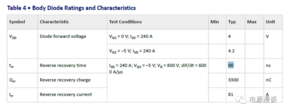 內(nèi)部SiC mosfet的寄生體二極管的正向電壓較大,為4V,給定測試條件下,其反向恢復(fù)時(shí)間為90ns,反向恢復(fù)電流為81A,反向恢復(fù)電荷為3300nC。