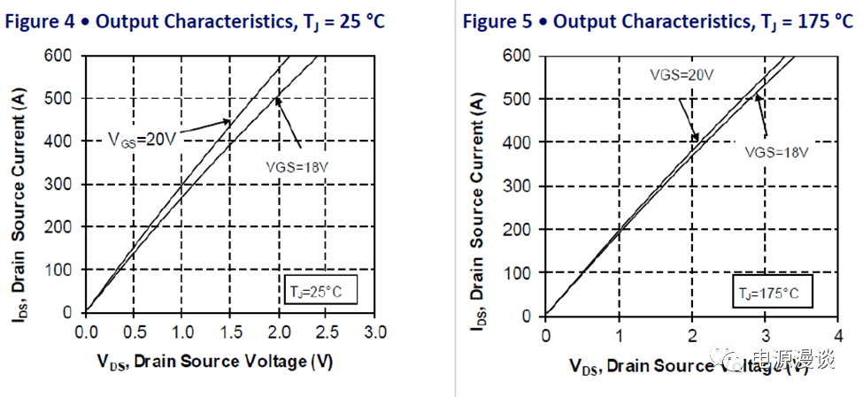 驅(qū)動(dòng)電壓影響導(dǎo)通電阻的關(guān)系如上圖可見,在20V驅(qū)動(dòng)電壓相比18V驅(qū)動(dòng)電壓下阻抗更低,曲線的斜率代表導(dǎo)通電阻信息。