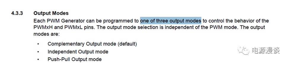 接下來,我們討論一下獨(dú)立模式輸出。這種模式下在芯片內(nèi)部,PWM產(chǎn)生器的輸出是同時(shí)連接在PWMxH和PWMxL的pin上的,二者輸出信號(hào)是一樣的,所以一般情況下只需要PWMxH就可以了,將PWMxL的輸出disable后,PWMxL可以作為GPIO pin或者其它外設(shè)的輸出來使用。