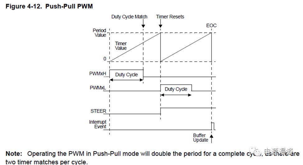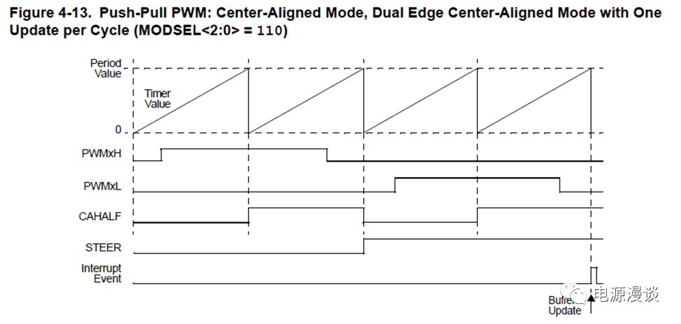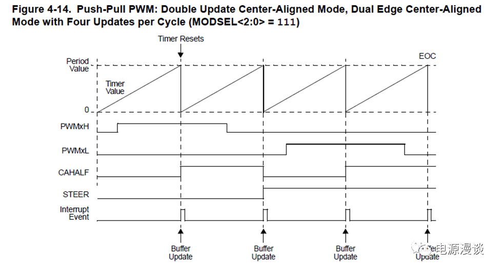 注意在這種模式配合下,本身中心對(duì)齊模式中有一個(gè)標(biāo)志位CHALF表示中心對(duì)齊模式的上升PWM timer還是下降部分的PWM timer,而在推挽模式下有STEER標(biāo)志位,表示PWM輸出pin處在PWMxH還是PWMxL輸出部分,這兩個(gè)標(biāo)志需要區(qū)分開來??偟膩碚f,四次PWM timer會(huì)發(fā)生一次EOC中斷和Buffer寄存器更新。
