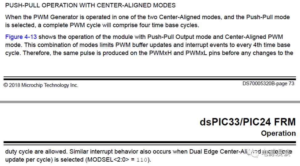 對(duì)雙邊沿中心對(duì)齊模式的單更新模式(MODSEL=0b110),也是相同的情況。雙邊沿中心對(duì)齊模式可以參考前述文章,數(shù)字控制芯片dsPIC33C的PWM運(yùn)行模式簡(jiǎn)析 ,這里不多說了。