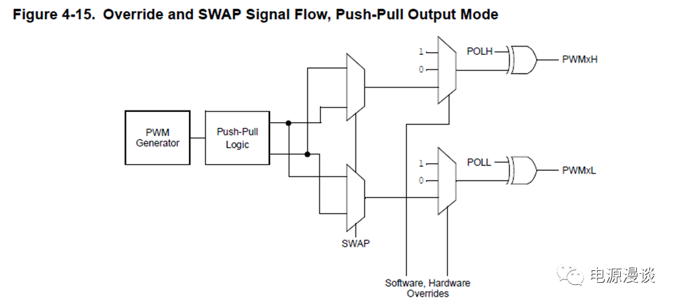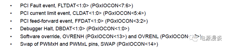 從上圖可以看出,PWM pin的輸出改寫包括三種PCI事件,及debugger停止?fàn)顟B(tài)的設(shè)置,及軟件改寫,或者PWMxH和PWMxL的交換。