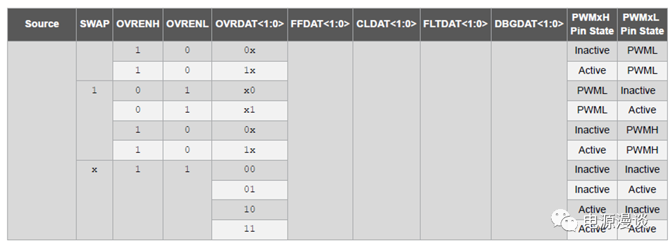 類似于互補(bǔ)模式,在推挽模式下,可以通過上述表格來決定PWMxH和PWMxL的輸出信號(hào)狀態(tài)。