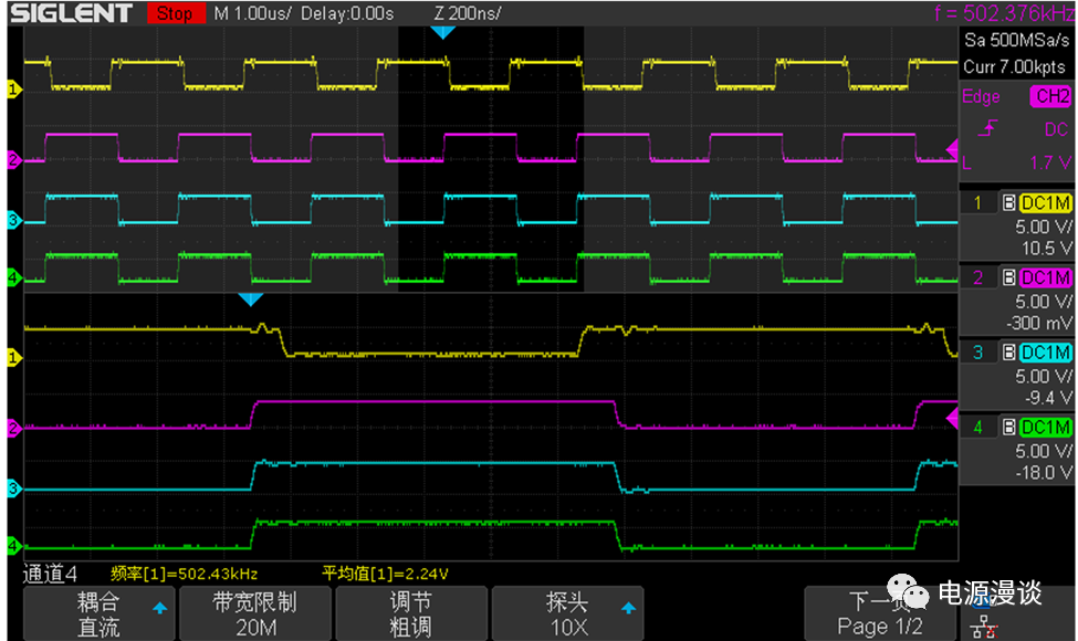 上述波形中CH1-PWM1H,CH2-PWM4H(PWM1L),CH3-PWM4H,CH4-PWM4L,其中CH2是PWM4H映射到PWM1L上的波形,PWM1和PWM4均為獨(dú)立邊沿模式運(yùn)行,且I/O獨(dú)立模式輸出,PWM1H在1/2周期觸發(fā)PWM4H。