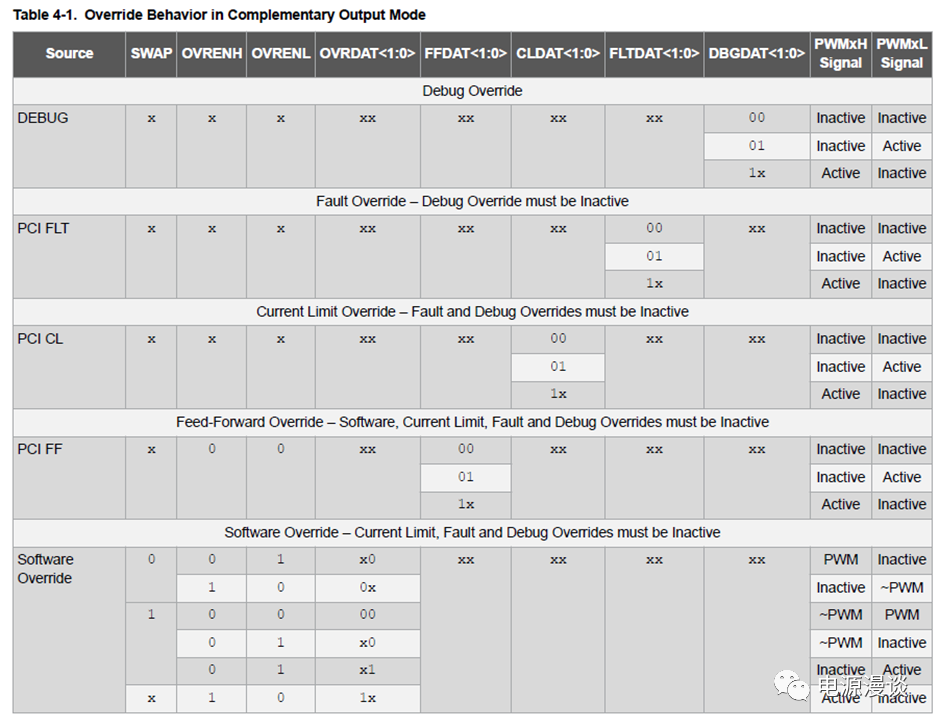 可以通過以上表格來確定不同改寫行為對(duì)應(yīng)的PWMxH和PWMxL的輸出。注意,在這個(gè)表格中,有效狀態(tài)是1,無效狀態(tài)是0,x代表不在乎這個(gè)pin的狀態(tài),~PWM表示PWM的互補(bǔ)狀態(tài)。