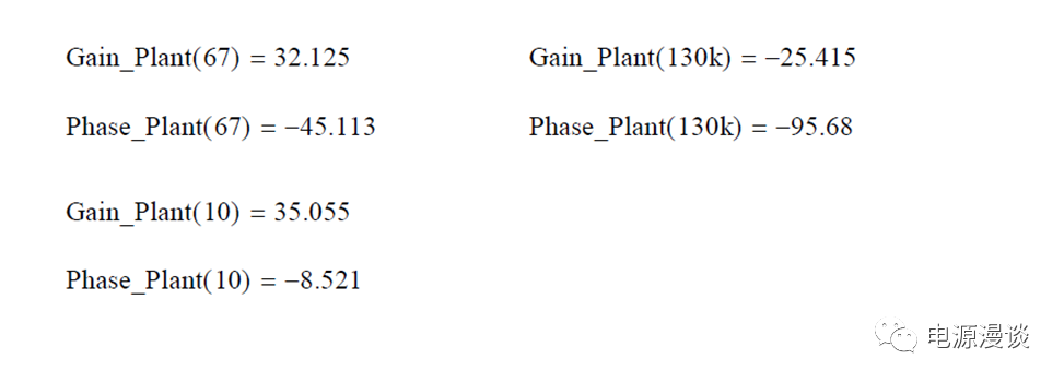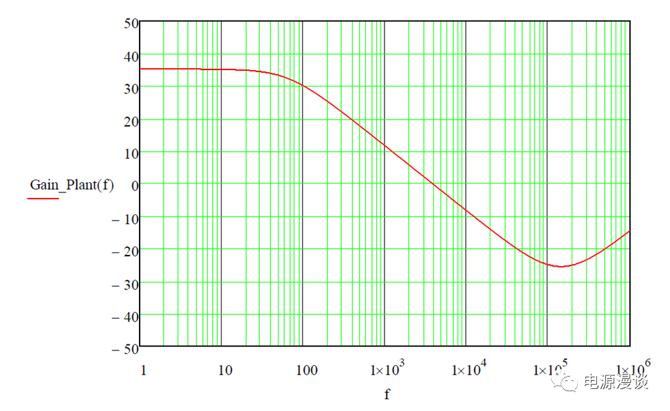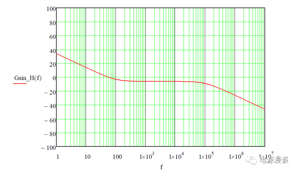 從控制器和功率級傳遞函數(shù)疊加的開環(huán)傳函來看,增益曲線在低頻段是一個積分環(huán)節(jié)的曲線,我們可以從曲線上讀取一些關(guān)鍵參數(shù)。