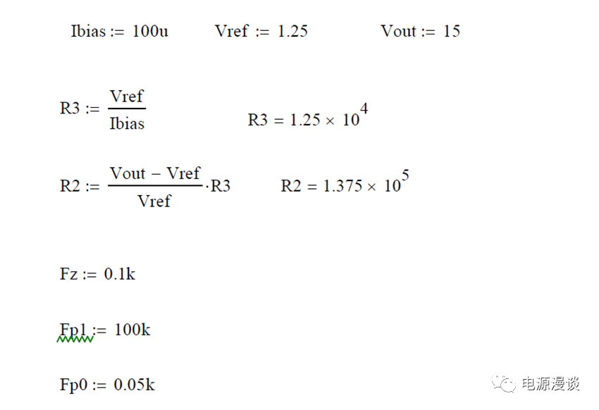 類似于BUCK電路設(shè)計,我們基于偏置電流的方法,根據(jù)基準電壓1.25V,我們計算出下分壓電阻為12.5kohm,上分壓電阻為137kohm,用于抵消系統(tǒng)主極點的零點設(shè)計在100Hz,而積分截止頻率設(shè)置在50Hz,高頻極點設(shè)置在100kHz,在右半平面零點和ESR零點的頻率前。