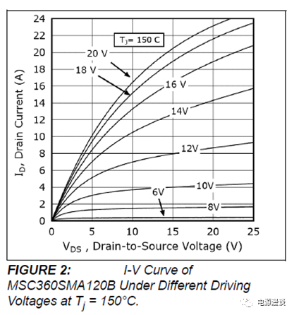 這里圖中表示的是MSC360SMA120B這個(gè)1200V的SiC mosfet,在Tj為150C時(shí)的驅(qū)動(dòng)電壓影響,可看出18V驅(qū)動(dòng)和20V驅(qū)動(dòng)之間的I/V曲線差異非常小,而16V驅(qū)動(dòng)和20V驅(qū)動(dòng)之間的差異就比較明顯了。