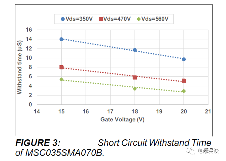 接下來(lái)這個(gè)例子,我們以MSC035SMA070B為例,測(cè)試VDS在350V,470V,560V的時(shí)候,及VGS在20V,18V,15V的情況,可以看出對(duì)短路電流耐受時(shí)間SCWT影響最大的是漏極電壓,其次是門級(jí)驅(qū)動(dòng)電壓。