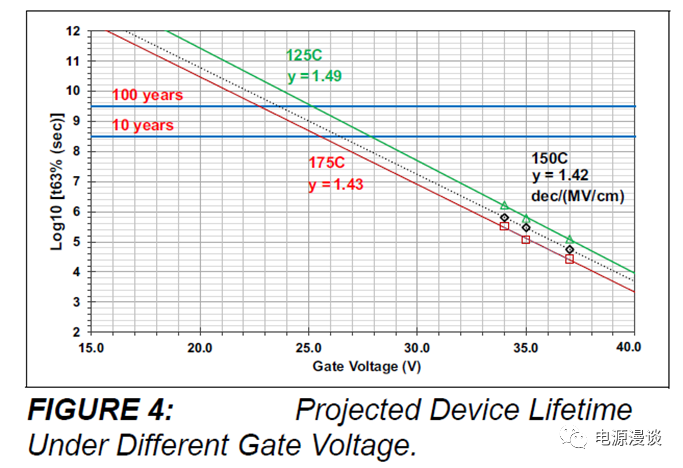 從上圖可以看出,隨著門級(jí)電壓橫坐標(biāo)和三條曲線上的溫度的增加,門級(jí)電壓越高,溫度越高,則設(shè)計(jì)壽命越小。從圖上也可以看出,當(dāng)門級(jí)電壓每增加2.5V時(shí),則設(shè)計(jì)壽命(縱坐標(biāo)對(duì)數(shù)坐標(biāo))將減小一個(gè)數(shù)量級(jí)。上述結(jié)論在很寬的工作范圍內(nèi)都是成立的,這是一個(gè)磨損機(jī)制,在時(shí)間的積累上去累積失效。