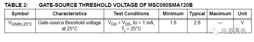 當(dāng)使用VGSoff為0V時(shí)作為SiC mosfet的關(guān)斷驅(qū)動(dòng)電壓,在高速硬開關(guān)應(yīng)用中,需要特別注意。在討論一些注意事項(xiàng)前,需要對(duì)門限電壓,夾斷電壓概念需要確認(rèn),如下圖7的表格2來(lái)自于Microchip的SiC mosfet,1200V,80mohm的TO247封裝的器件。