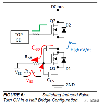 在半橋電路的配置中,誤開通來(lái)自于米勒電容CGD, 如圖8所示.當(dāng)上管開通時(shí),中點(diǎn)電壓的dv/dt會(huì)導(dǎo)致CGD流過(guò)大電流,這就會(huì)在門級(jí)關(guān)斷電阻ROFF上產(chǎn)生一個(gè)大的電壓差, 這個(gè)電壓差將會(huì)導(dǎo)致下管的實(shí)際的門極電壓VGS高于穩(wěn)態(tài)的關(guān)斷電壓VEE,這個(gè)電壓足夠高的話會(huì)開通下管Q1,在Vp上的裕量會(huì)阻止誤開通。