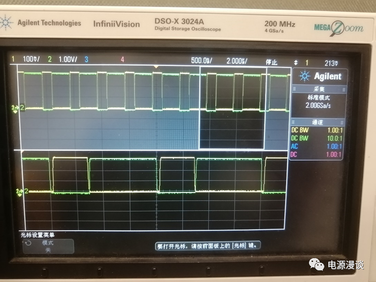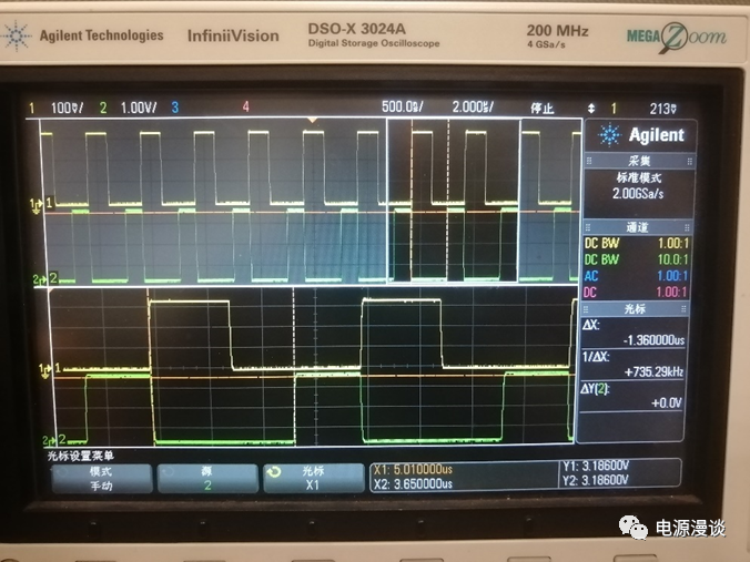 如圖18中,CH1為PWM1H波形,CH2為I/O在ADC中斷中的翻轉(zhuǎn)標志,從圖上看,后移AN13的觸發(fā)位置后,離開ADC中斷后不需要等待,通過立即更新設(shè)置讓環(huán)路計算結(jié)果作用以改變電壓模式控制的控制量占空比。