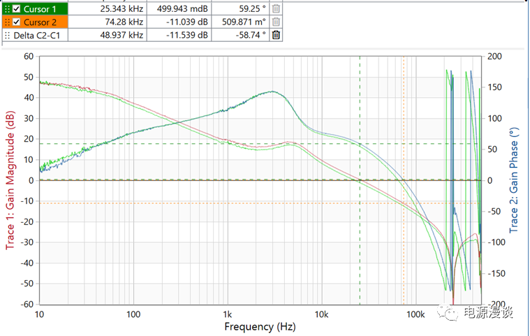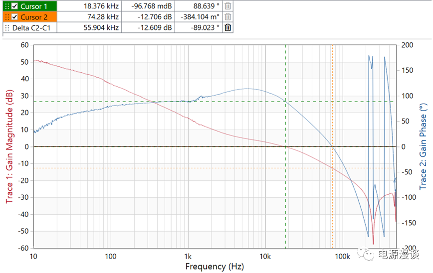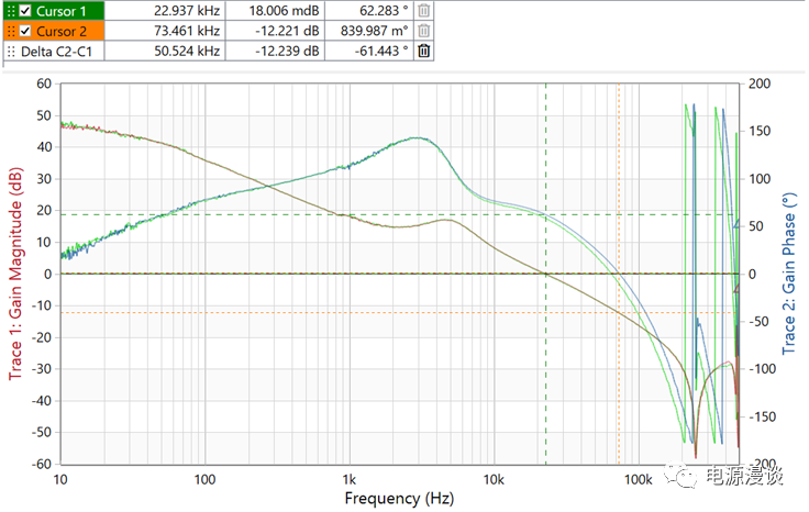 后面的測試,我們僅僅對比滿載時的環(huán)路曲線,將增加ADC早中斷的情況下的BODE圖放置在這里,作為背景,如圖12所示。