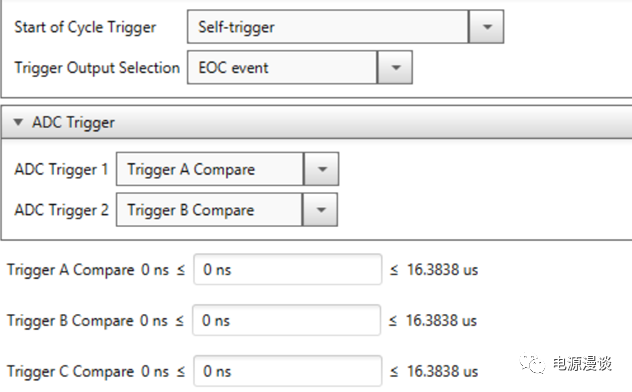 此處由于采用共享內(nèi)核去做ADC采樣轉(zhuǎn)換,且會先采樣轉(zhuǎn)換AN12輸入電壓信號,因此看起來進入AN13 的ADC中斷采樣轉(zhuǎn)換延時偏大,達到960nS,在實際應(yīng)用中可采用專用內(nèi)核去做輸出電壓的采樣,且實施早中斷等措施減小采樣轉(zhuǎn)換延時。