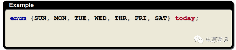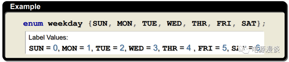 如上圖2的示例中,我們定義了一個weekday這樣一個枚舉變量,其中包含七個常數(shù)標(biāo)簽,SUN,MON,TUE,WED,THR,FRI,SAT這七個常數(shù)標(biāo)簽。默認情況下,它們的值為從0到6的整數(shù)。