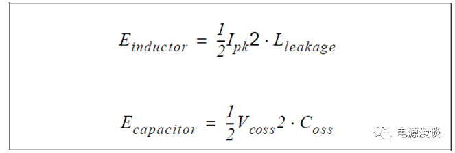 T5,在階段t5,反激MOSFET Q1開(kāi)始ZVS切換,此時(shí)輸出二極管反向偏置,輸出電容給負(fù)載供電。為了使Q1的ZVS發(fā)生,非常重要的是,當(dāng)反激MOSFET關(guān)斷時(shí),t1階段電感中的能量大于給Q1 的Coss充電的能量,使得Q1 MOSFET的體二極管可以正向偏置,存儲(chǔ)在電感中的能量和需要給Coss充電的能量可以計(jì)算如下圖6所示,漏感峰值電流Ipk可以計(jì)算如圖7所示。