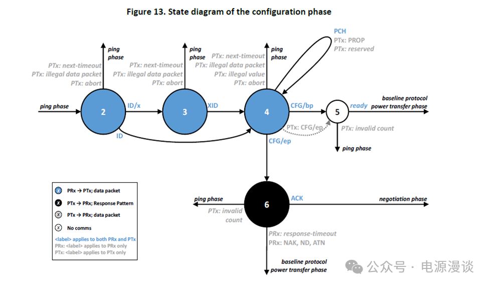 圖 12 總結(jié)了配置階段的數(shù)據(jù)流,電力接收器使用以下方式識別自身,識別(ID)數(shù)據(jù)包和可選的擴(kuò)展識別(XID)數(shù)據(jù)包。它提供在功率傳輸合同中使用可選的功率控制延遲 (PCH) 數(shù)據(jù)包的數(shù)據(jù), 和配置(CFG)數(shù)據(jù)包。在最后一步中,功率發(fā)射器確認(rèn)擴(kuò)展協(xié)議(如果適用的話)。