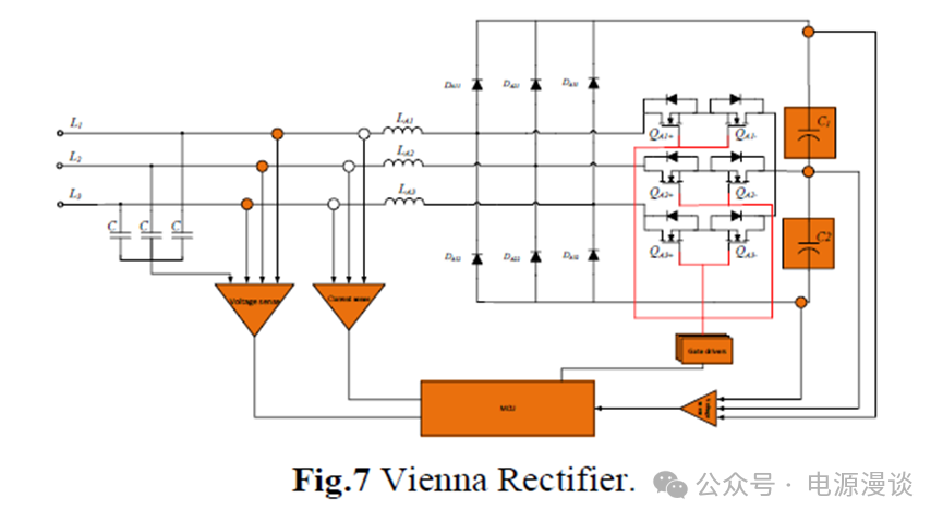 三相維也納PFC整流器,如圖7, 于1993 年在維也納技術(shù)大學(xué)開發(fā),用于避免在單向整流中發(fā)生低頻電源電流諧波,僅通過在進(jìn)入三相二極管電橋的每個(gè)相橋臂上,插入可關(guān)斷功率半導(dǎo)體開關(guān)。