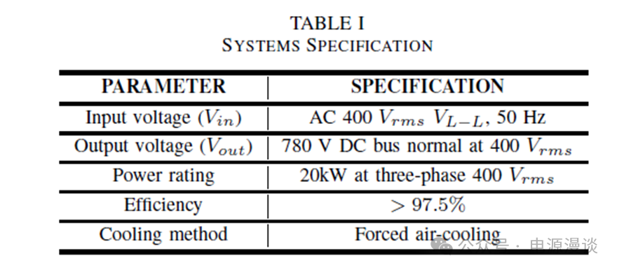 從上述表格中,我們得知輸入電壓是典型值線電壓為400V RMS電壓的規(guī)格的50Hz工頻電壓,考慮到經(jīng)過三相整流后的直流電壓為780V附近,在強(qiáng)制風(fēng)冷的條件下可以實(shí)現(xiàn)20kW下較高的效率。