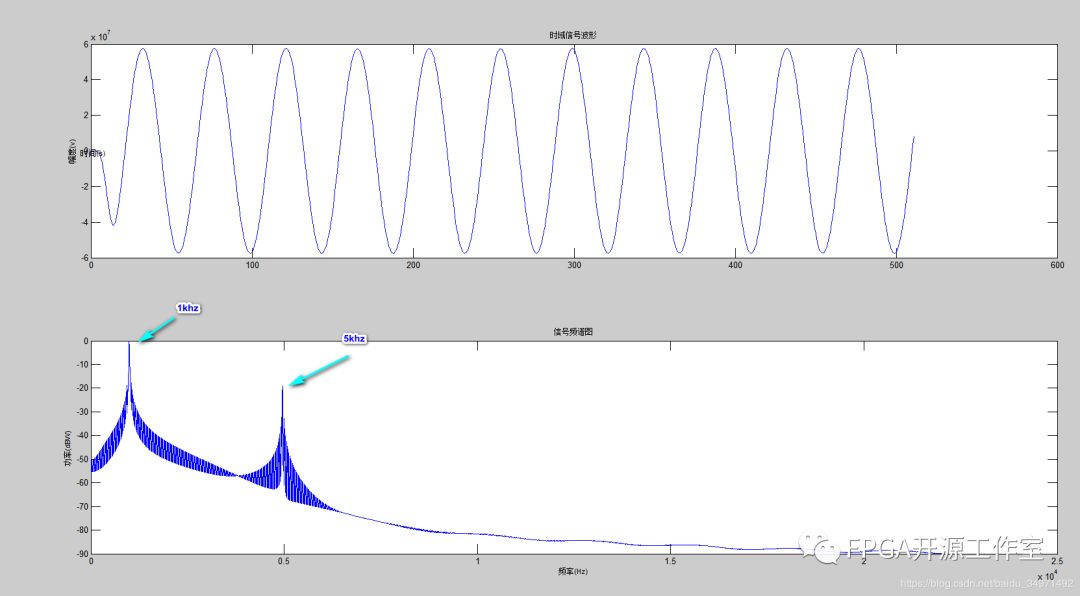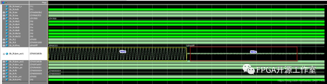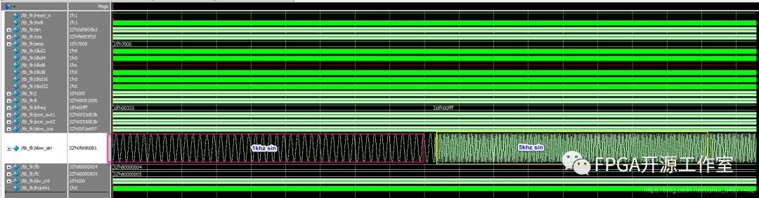 fpga實驗modelsim仿真結(jié)果,從圖5來看1khz幾乎保持不變,而5khz波形幅度上被抑制了很多。