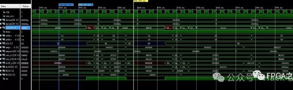 那么最終的仿真結(jié)果:如果直接查詢的話,結(jié)果輸出延時一個時鐘周期,如果線性逼近的方法得到,延時3-5個時鐘周期,這里周期設(shè)定為20ns;