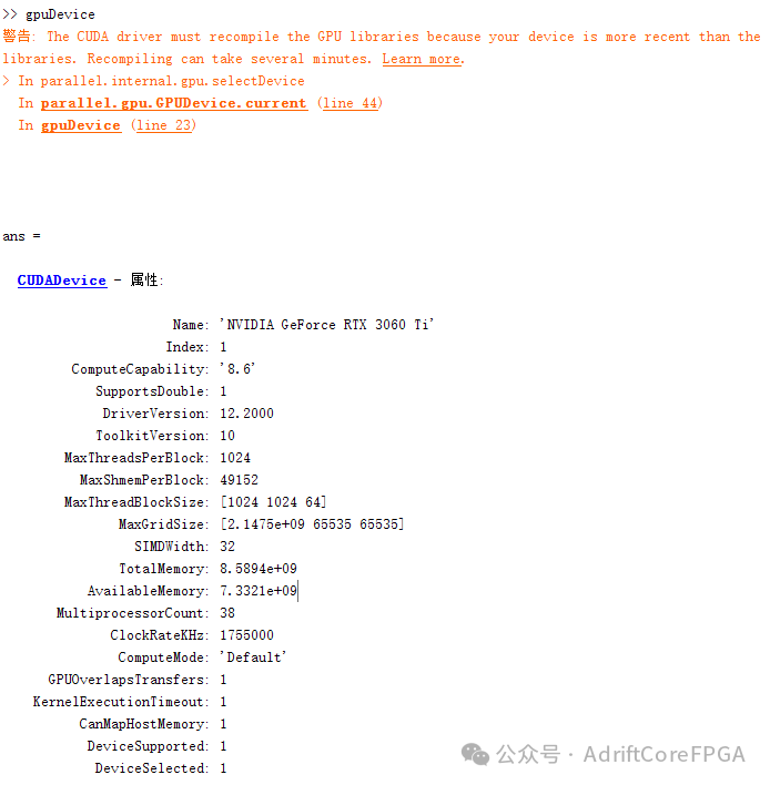 DeviceSelected: 1,該設(shè)備是否被 MATLAB 選擇為當(dāng)前 GPU 設(shè)備。1 表示已選擇,0 表示未選擇。