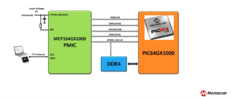 MCP164GX1000:給PIC64GX1000 MPU + DDR4供電的框圖