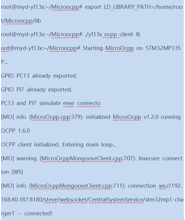 在MYD-YF13X平臺部署MicroOcpp客戶端的過程中,我們充分利用了平臺提供的Linux 6.6.78系統(tǒng)環(huán)境。首先交叉編譯MicroOcpp源碼庫,生成針對ARM架構(gòu)的優(yōu)化可執(zhí)行文件。隨后配置GPIO引腳模擬充電槍連接狀態(tài):使用兩個GPIO口分別代表兩個充電接口的狀態(tài)檢測。